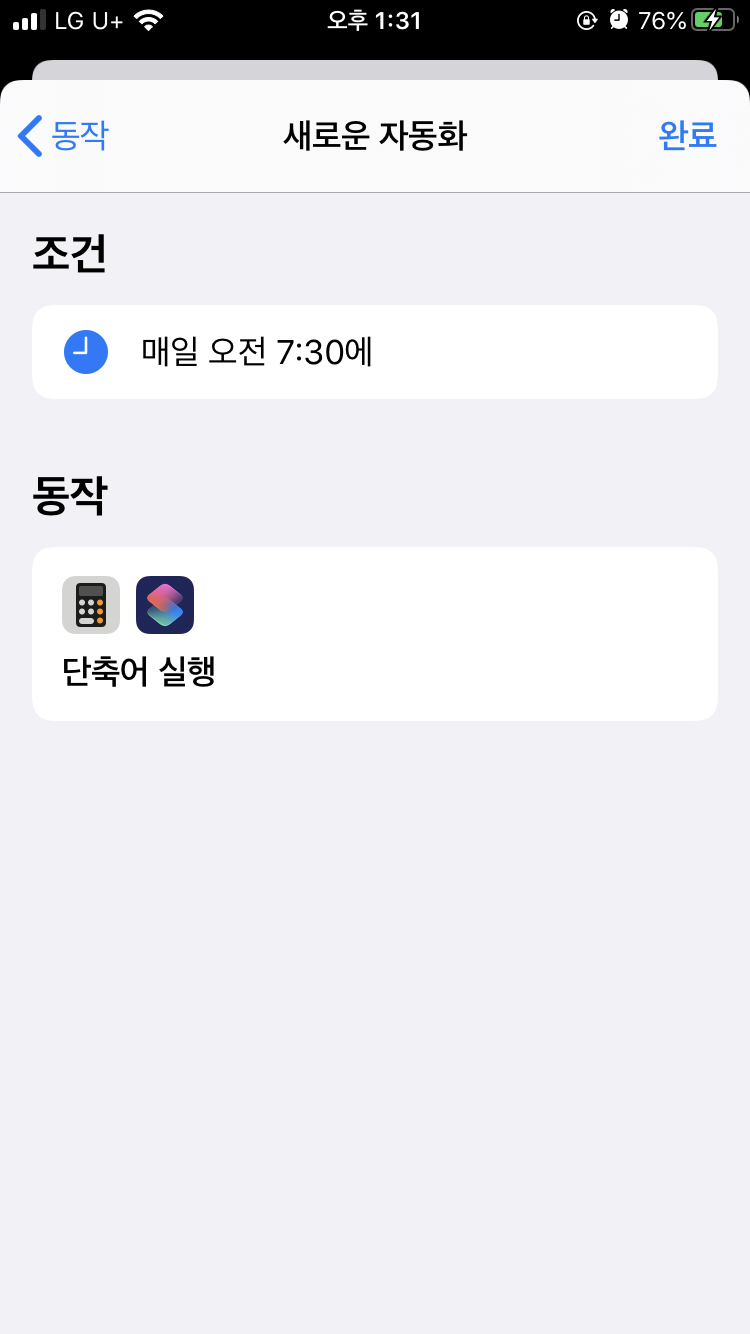 그다음 단축어 실행도 찾으셔서 끌어오시면 아래 스크린샷처럼 나옵니다.