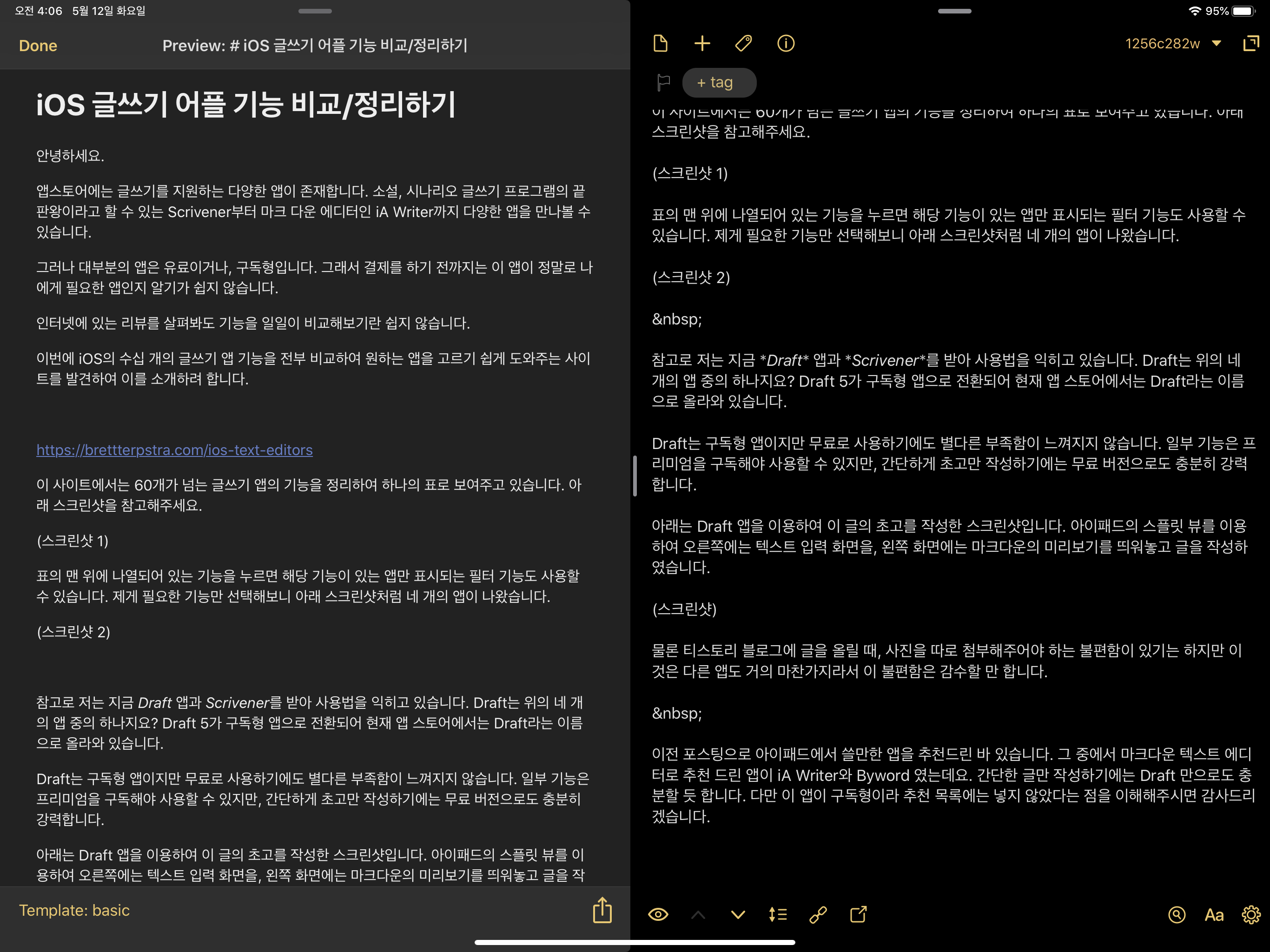 아래는 Draft 앱을 이용하여 이 글의 초고를 작성한 스크린샷입니다. 아이패드의 스플릿 뷰를 이용하여 오른쪽에는 텍스트 입력 화면을, 왼쪽 화면에는 마크다운의 미리보기를 띄워놓고 글을 작성하였습니다.