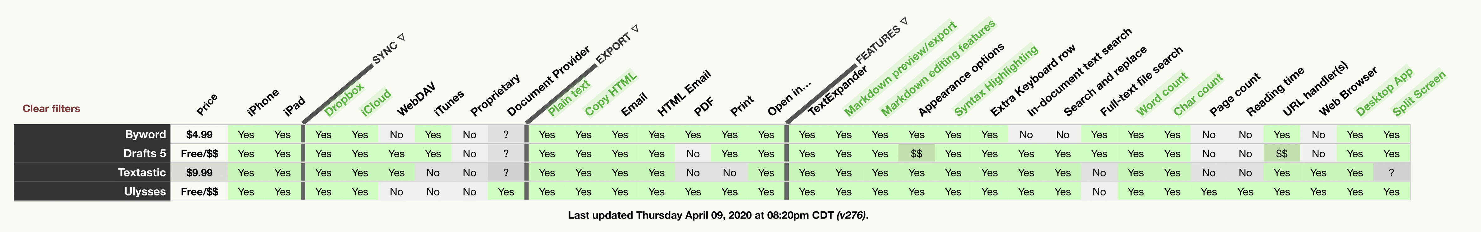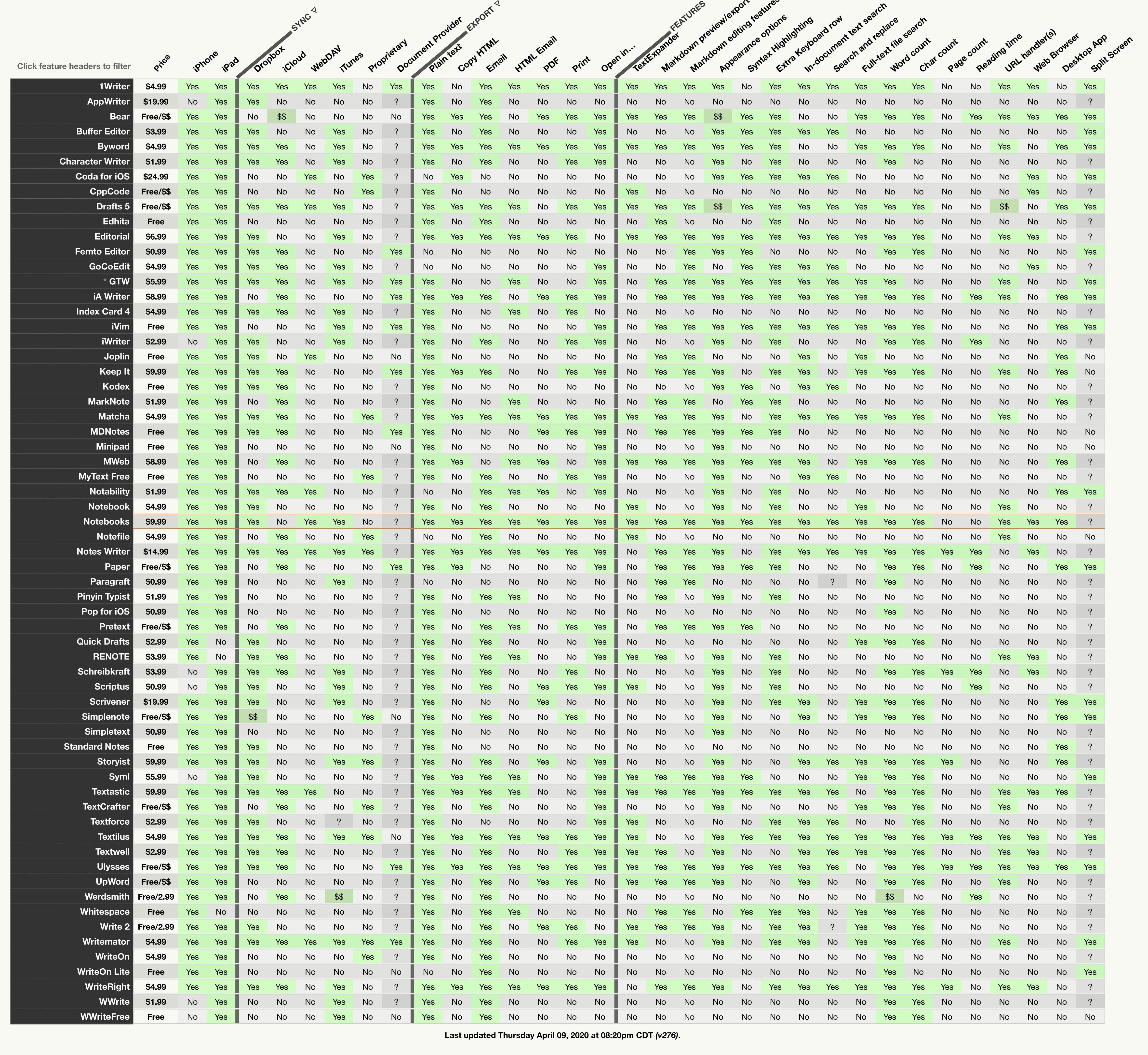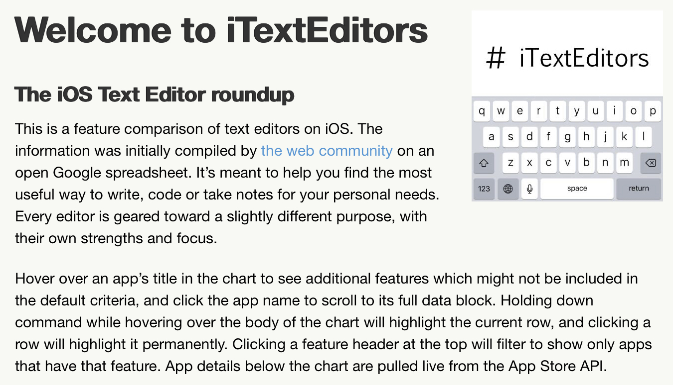이번에 iOS의 수십 개의 글쓰기 앱 기능을 전부 비교하여 원하는 앱을 고르기 쉽게 도와주는 사이트를 발견하여 이를 소개하려 합니다.