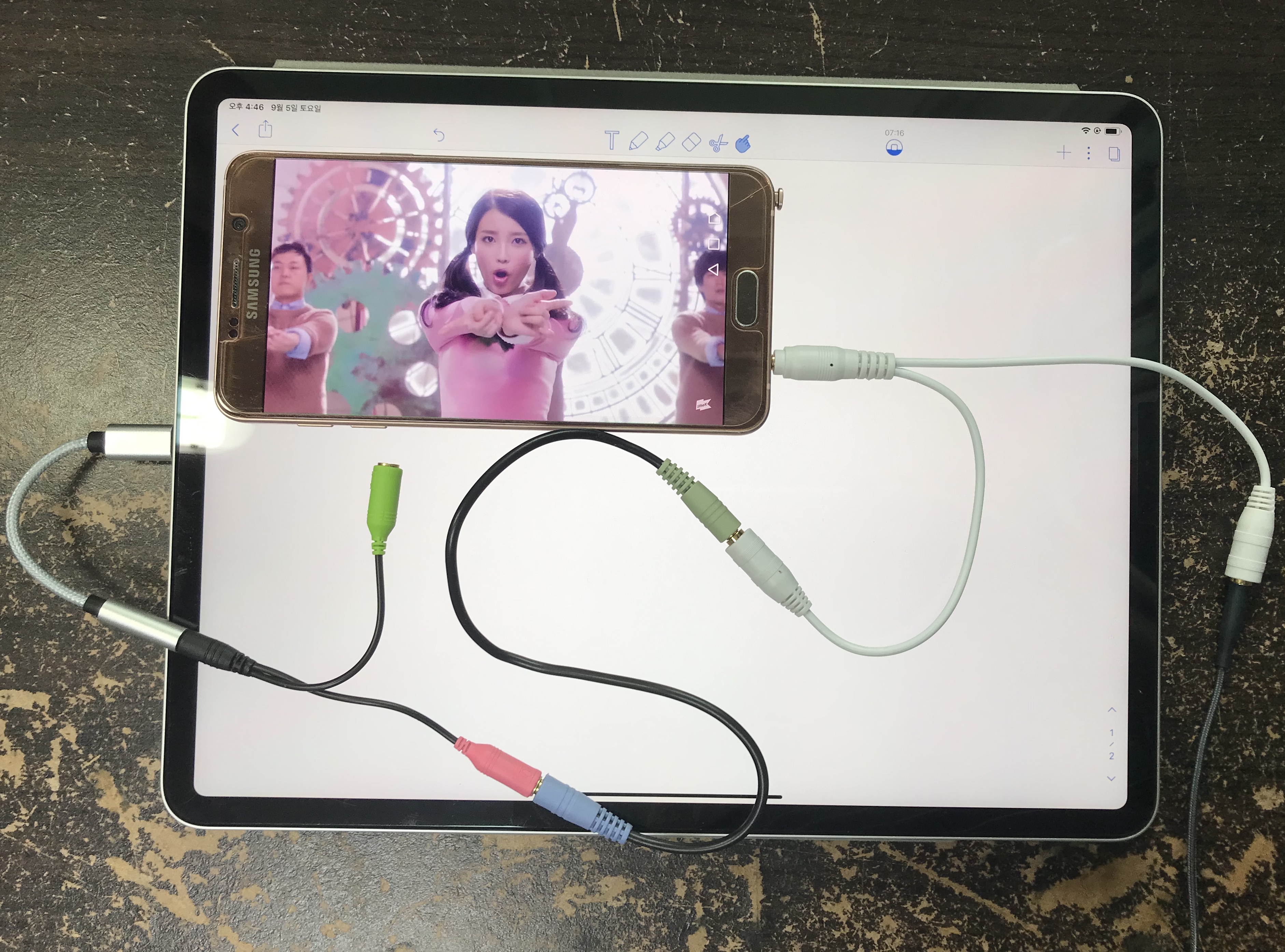 갤럭시 노트5에서 출력된 소리 신호는 두 갈래로 갈라져서 저도 들을 수 있고, 동시에 패드도 녹음을 할 수 있습니다.