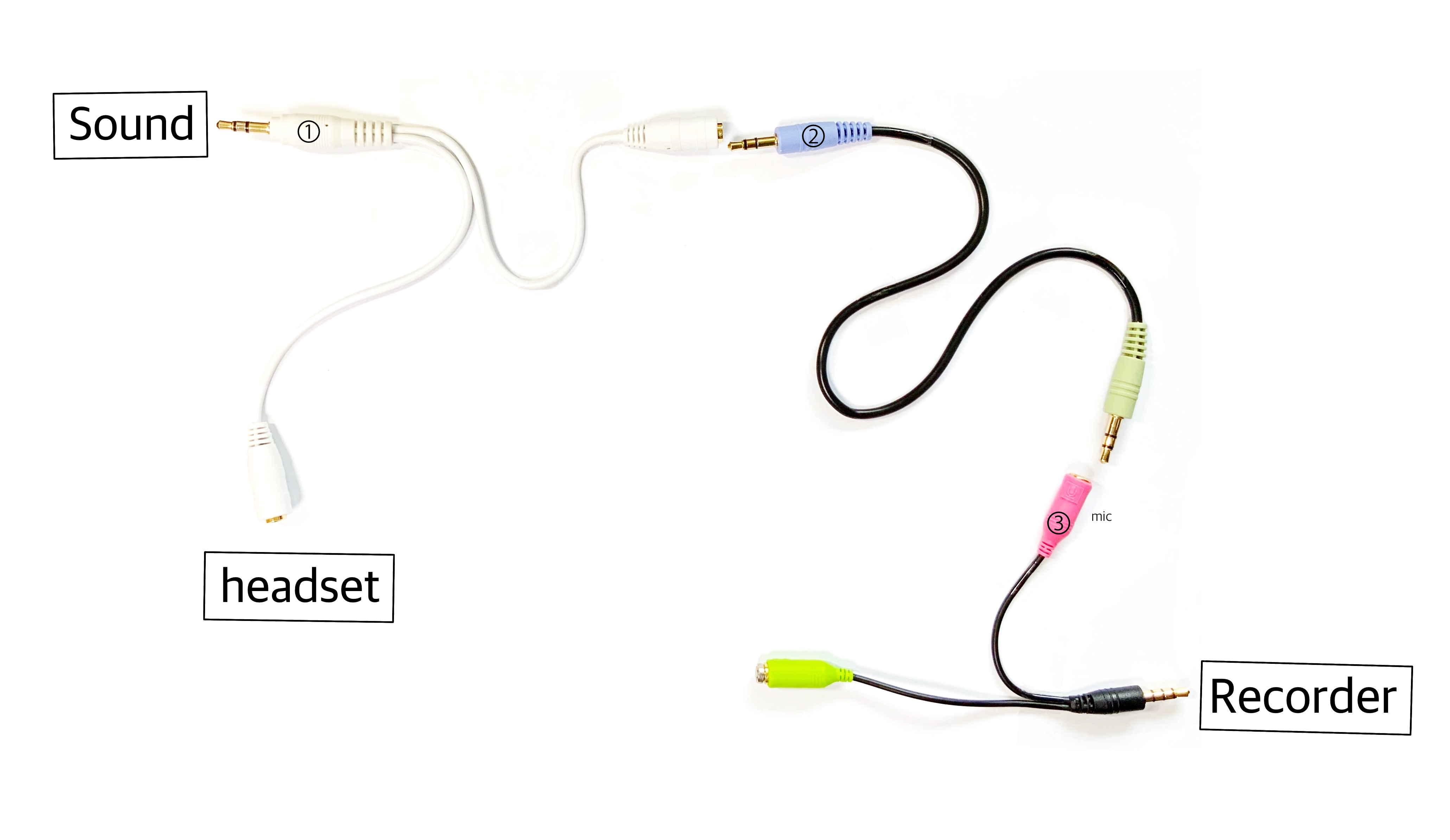 Sound에서 소리가 출력됨. → ①으로 소리가 입력됨. → ② 케이블을 거쳐서 ③번 마이크로 입력됨. → Recorder로 소리가 입력됨.