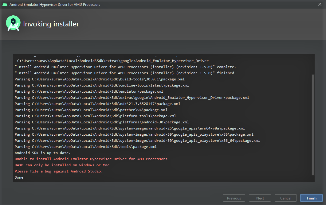Android Emulator Hypervisor Driver for AMD Processors installation failed.