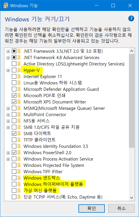 Windows 기능 켜기/끄기에서 다음과 같은 항목을 끄라는 답변을 얻었다.