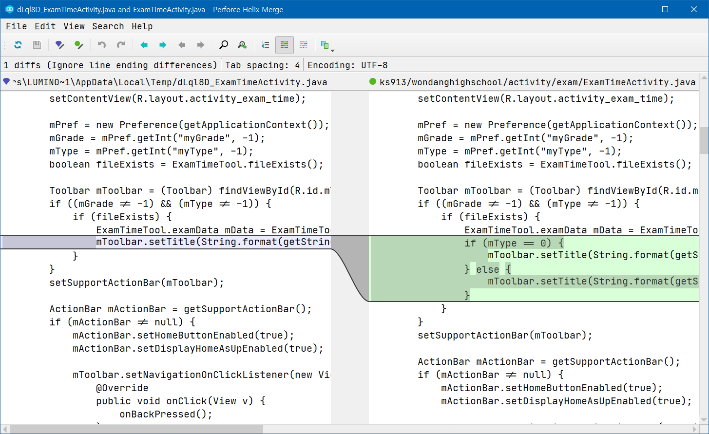 p4merge를 이용하여 변경된 내용을 확인할 수 있습니다.