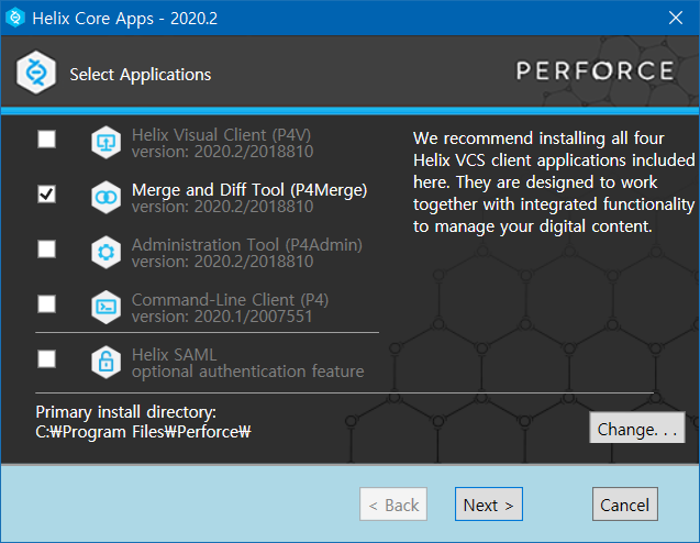 나머지는 모두 체크 해제해도 무방하며, Merge and Diff Tool (P4Merge)만 체크하여 설치합니다.
