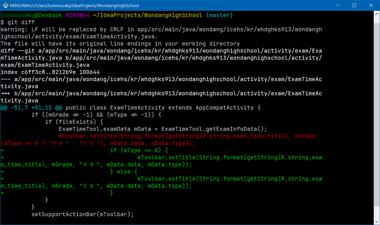 bash에서 git difftool을 입력하면 아래 스크린샷처럼 변경된 내용이 나타나게 됩니다.