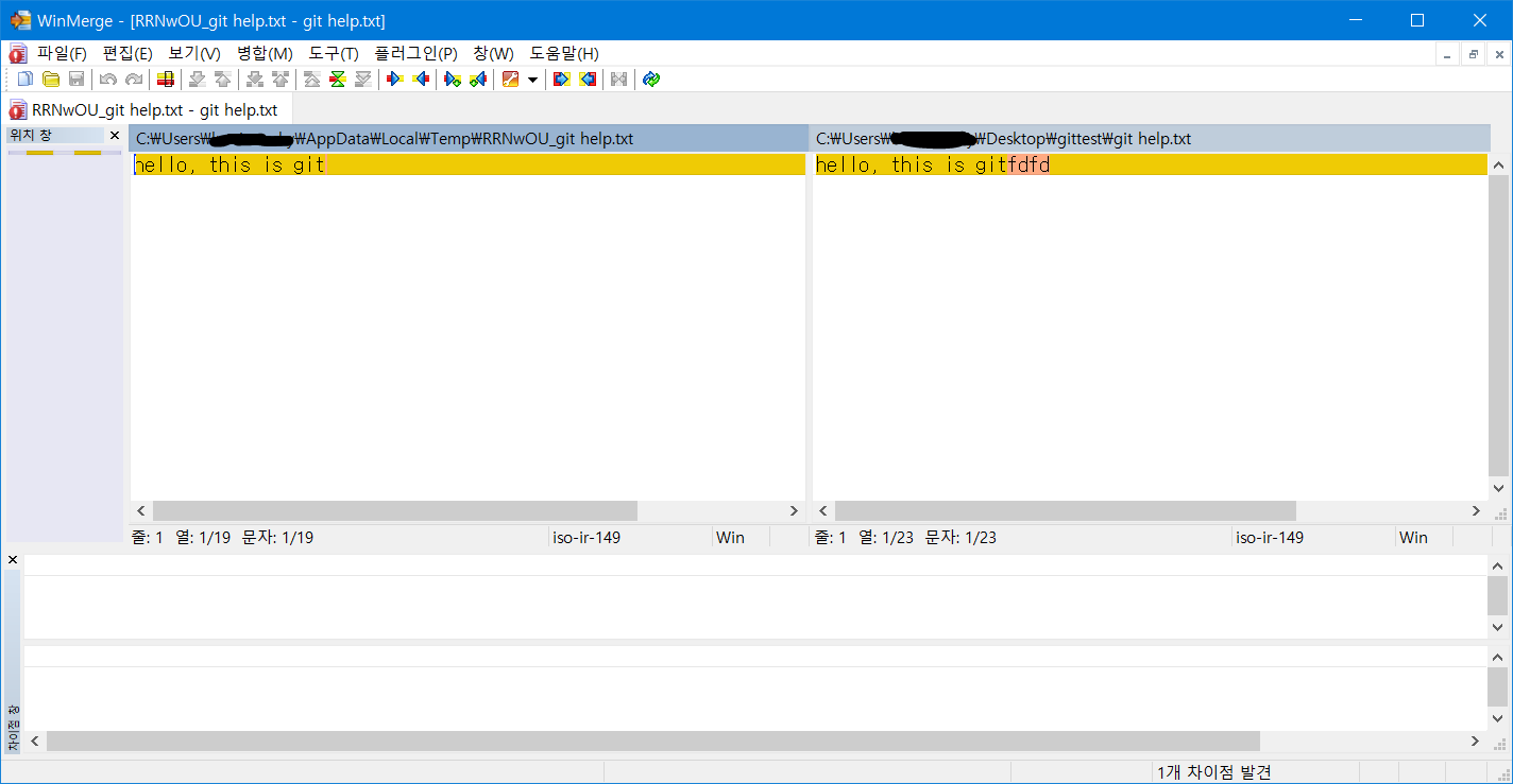 그리하면 아래 스크린샷처럼 WinMerge를 git difftool과 git mergetool으로 사용할 수 있습니다.