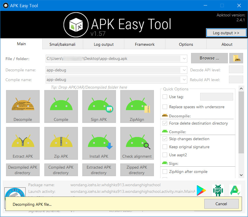 위 스크린샷은 Apk Easy Tool의 메인 화면이다.