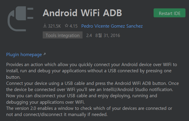 사이트는 https://plugins.jetbrains.com/plugin/7983-android-wifi-adb 이며, IDE의 Plugins 설정에서 쉽게 설치할 수 있다.