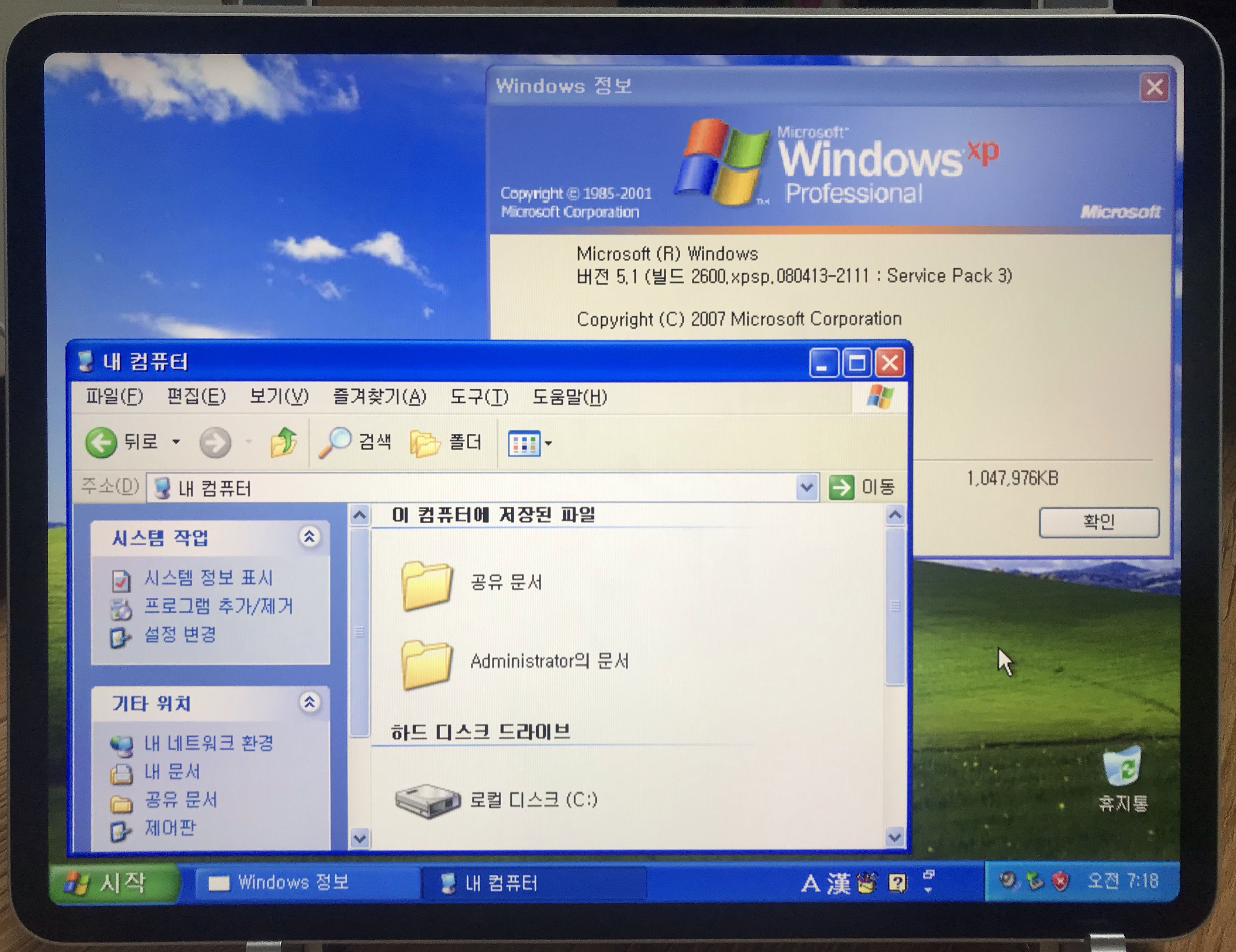 winver으로 확인한 XP 버전과, 탐색기 화면을 띄워놓고 찍은 사진이다.