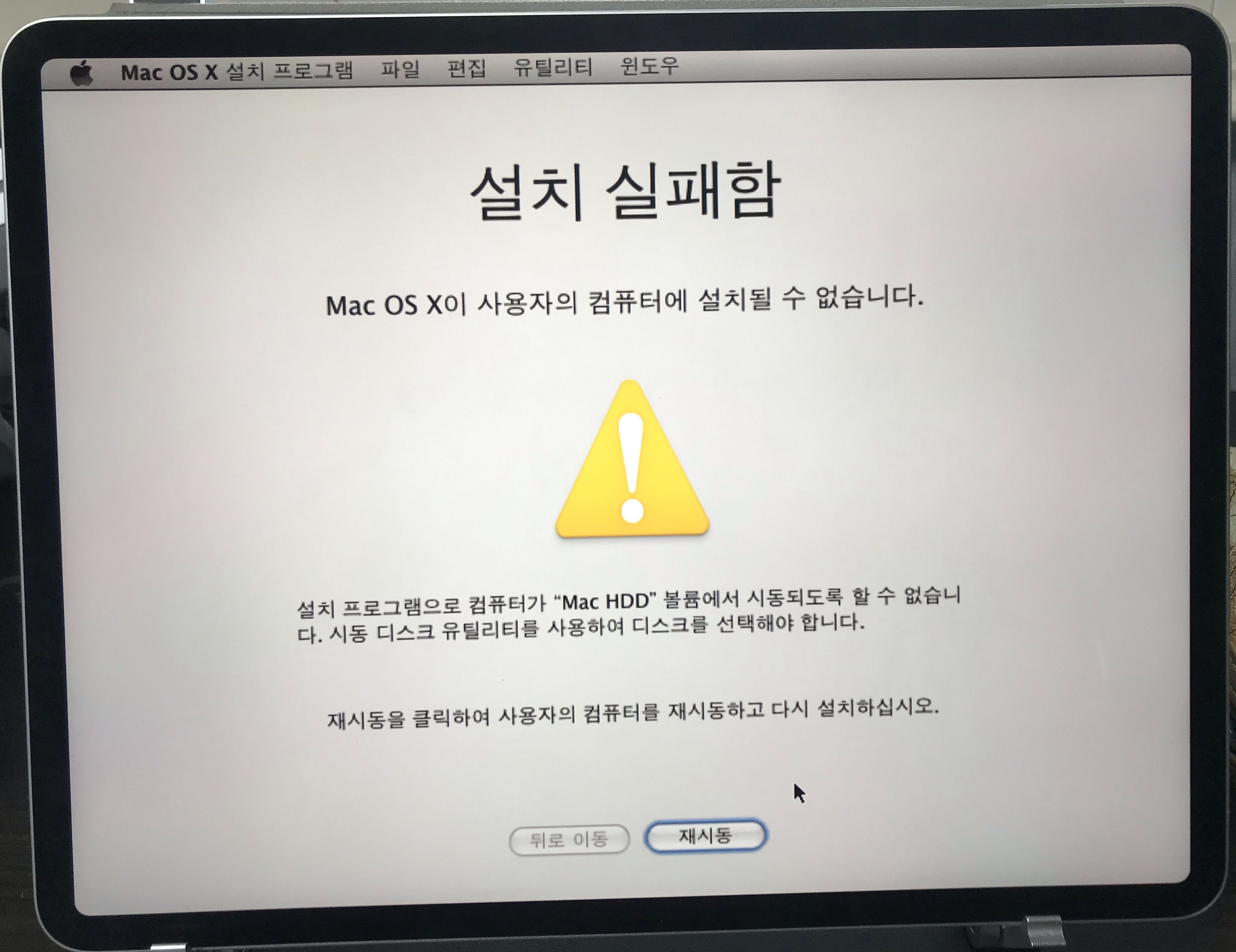 이 글씨가 대략 10분 넘게 유지되다가, 위 사진처럼 Mac OS 설치에 실패하였다는 화면이 떴다.