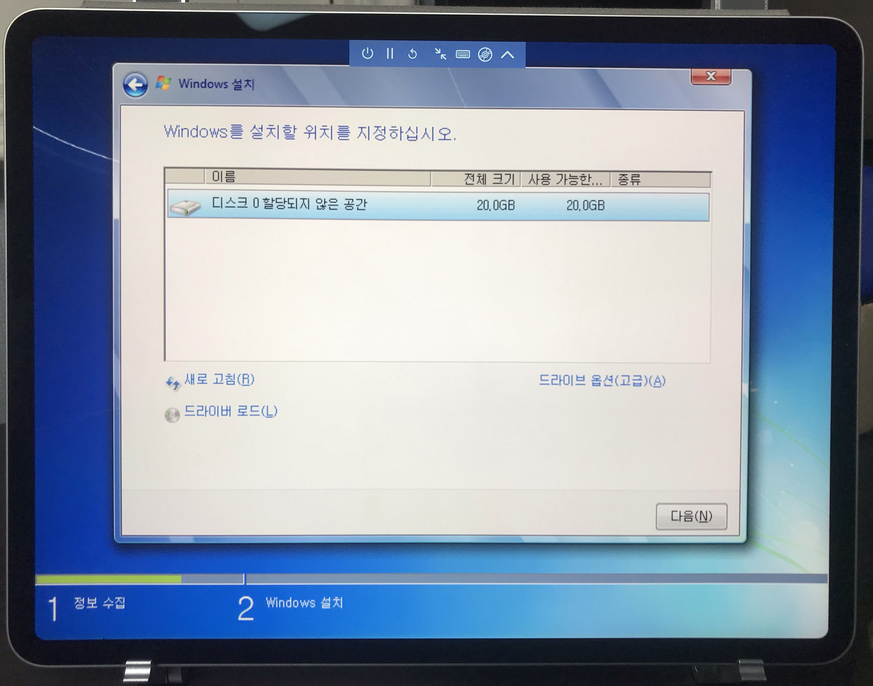 필자는 가상 하드 디스크 이미지의 용량을 20기가로 주었기 때문에, 저 사진에서 디스크 0가 20.0GB로 나타난다.