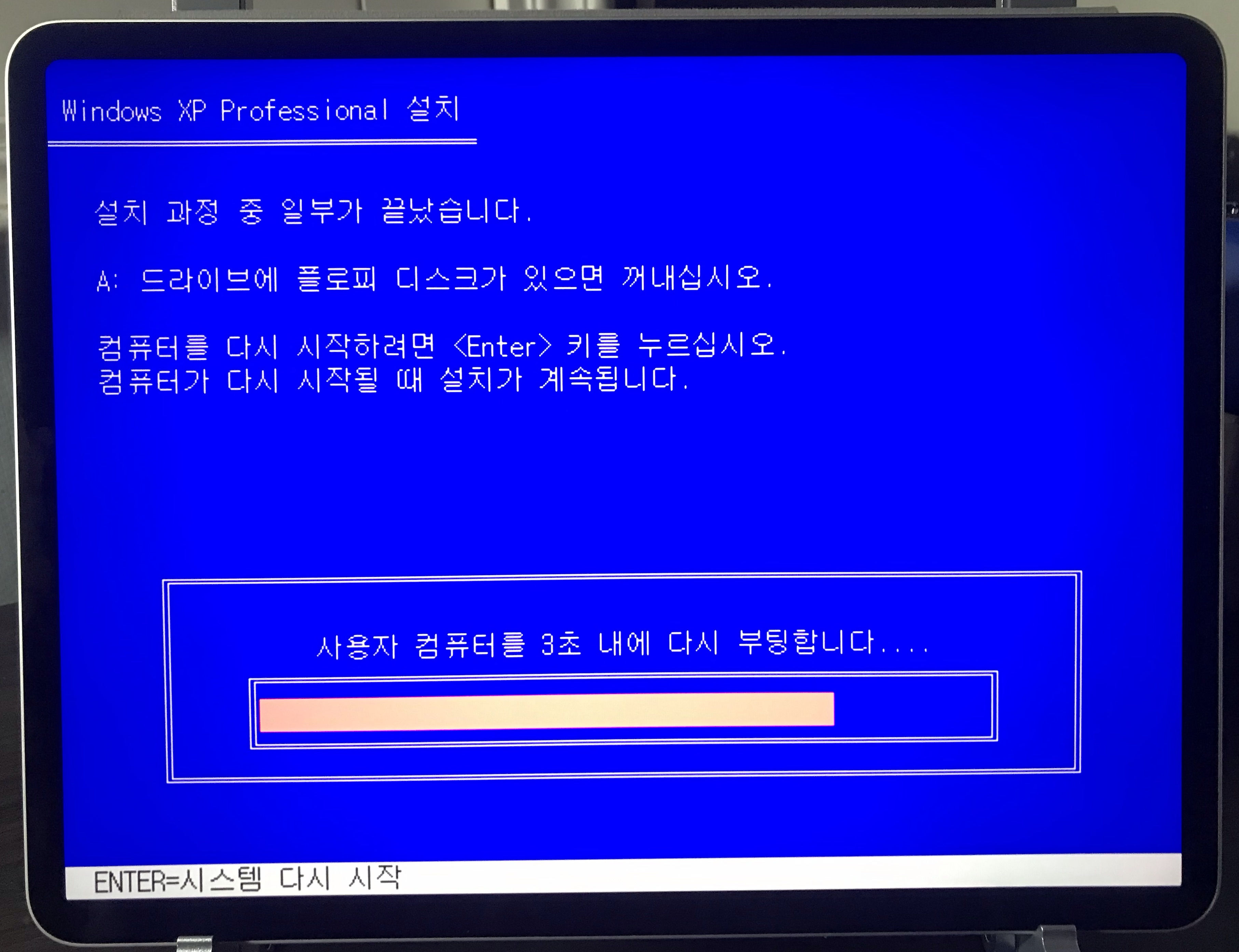 기다리다보면 설치 과정 중 일부가 끝났다며 자동으로 재부팅 한다는 안내가 뜬다.