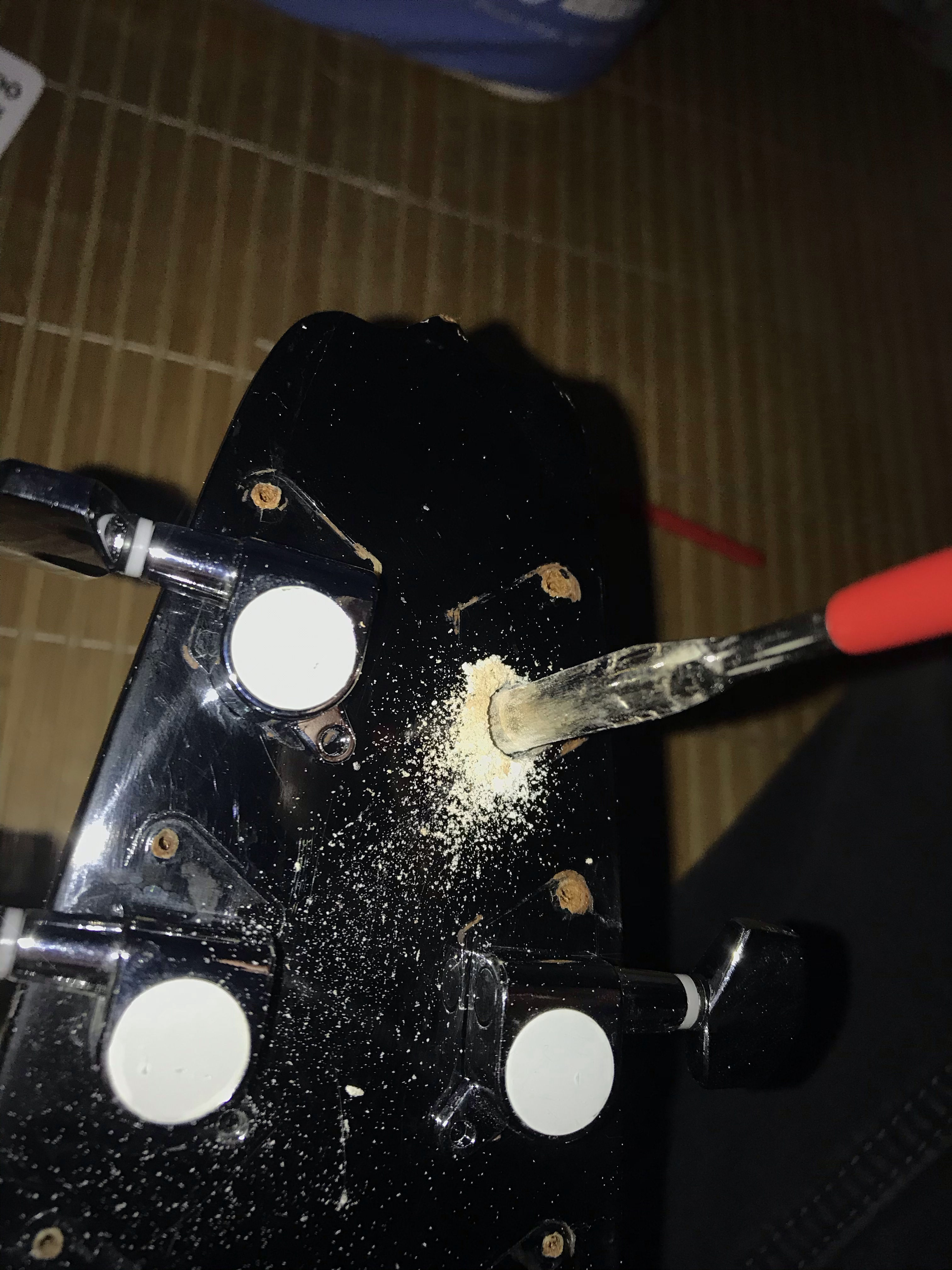 통기타 헤드의 구멍을 저 반원형 공구로 연마하면 구멍을 넓힐 수 있습니다.