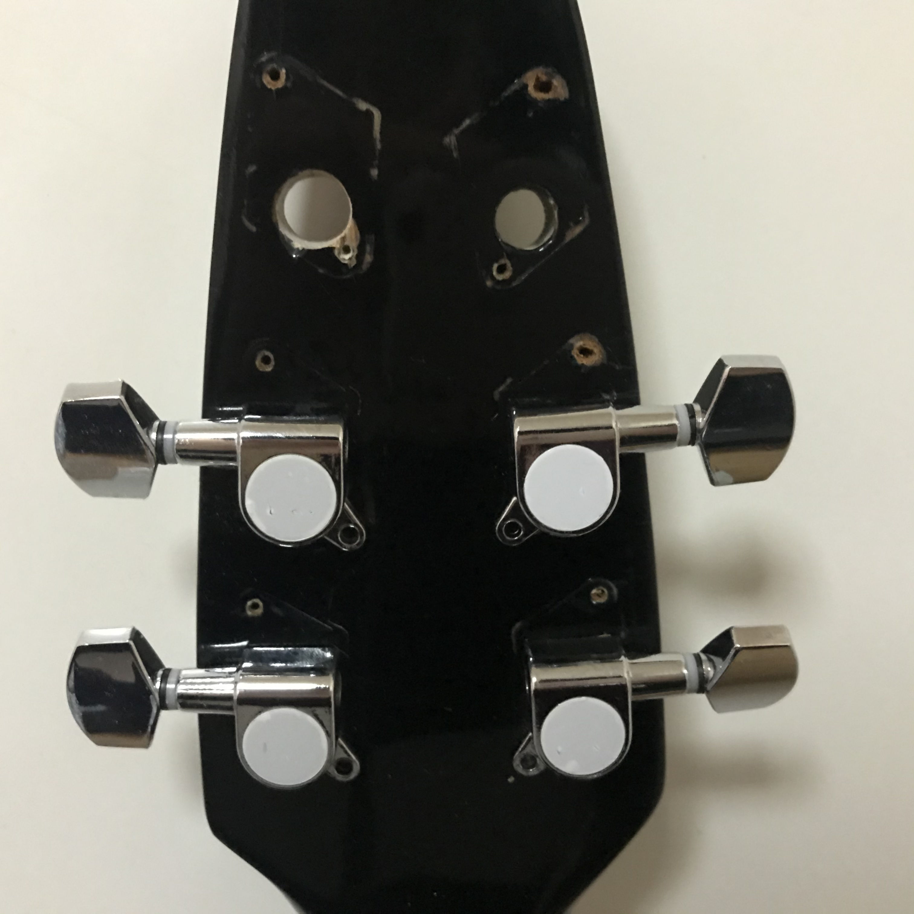삽질 끝에 통기타 헤드의 구멍을 성공적으로 넓혀 헤드머신을 전부 교체한 사진입니다.